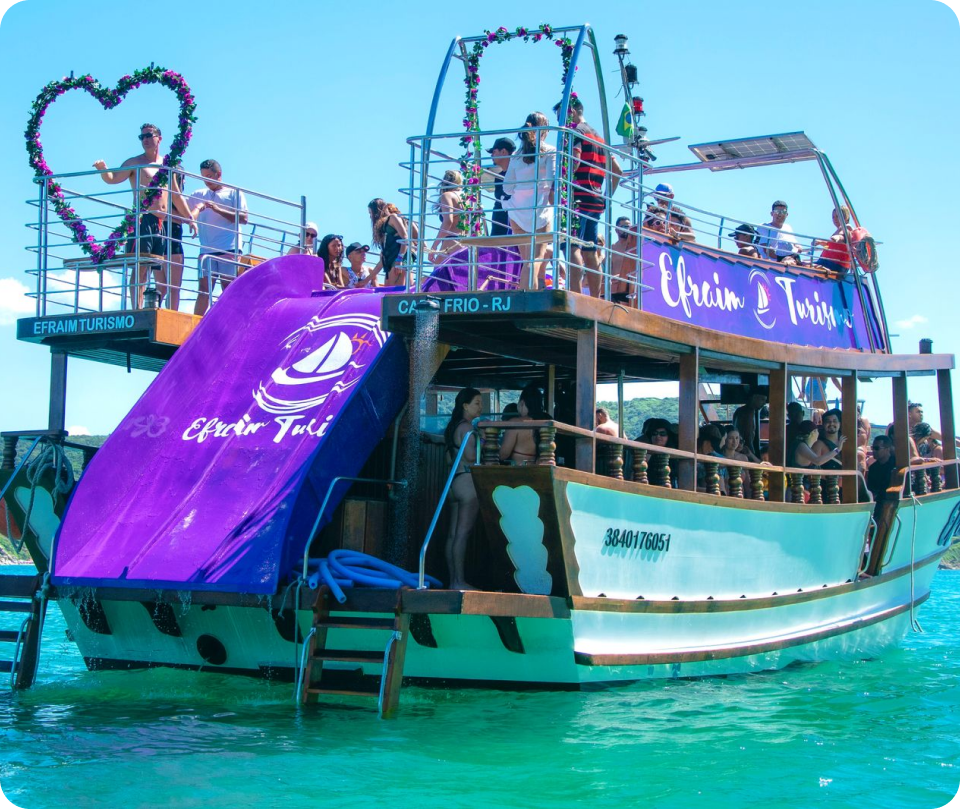Embarcação completa de 2 andares com toboágua, banheiros e bar a bordo. Tripulação experiente.
